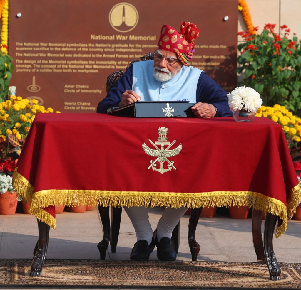 पंतप्रधानांच्या आगमनावेळी संरक्षण मंत्री राजनाथ सिंह आणि तिन्ही सैन्य दलांचे प्रमुख उपस्थित होते. युद्ध स्मारकावरील अमर चक्रासमोर काही वेळ मौन पाळून पंतप्रधानांनी शहीदांच्या शौर्याचे स्मरण केले. यानंतर त्यांनी स्मारकाच्या अभ्यागत पुस्तिकेत (व्हिजिटर बुक) आपला संदेश नोंदवला.