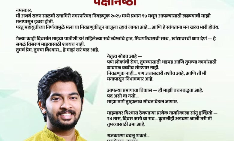अथर्व साळवी यांनी फेसबुक स्टेटसद्वारे ‘पक्षनिष्ठा’ या आशयाखाली आपल्या मनातील भावना व्यक्त केल्या आहेत. त्यांनी स्पष्ट केले की, महायुतीच्या निर्णयामुळे आपल्याला निवडणुकीतून बाजूला व्हावे लागत आहे. मात्र, “नेतृत्व सोडत आहे पण लोकांची सेवा, तुमच्यासाठी धडपड आणि तुमच्या कामासाठी धावपळ कधीच सोडणार नाही,” अशी ग्वाही त्यांनी दिली आहे. “राजकारण बदलू शकतं… पदं येतात-जातात… पण नातं? ते मात्र कायम राहतं – तुमचं आणि माझं,” असे भावनिक विधान अथर्व यांनी केले आहे.