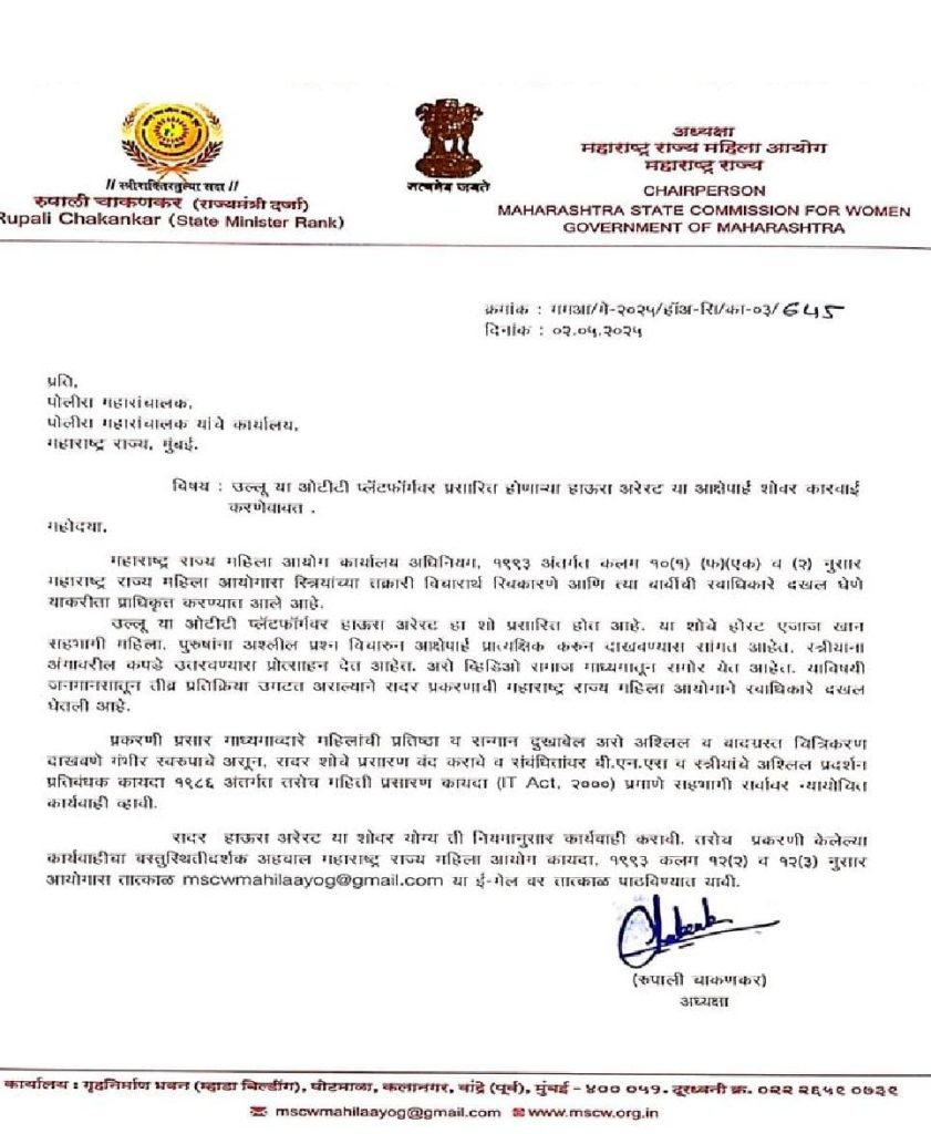 ‘हाऊस अरेस्ट’ शोमधील अश्लील कंटेंटवर तीव्र प्रतिक्रिया व्यक्त करत, आयोगाच्या अध्यक्षा रुपाली चाकणकर यांनी महाराष्ट्राच्या पोलिस महासंचालकांना पत्र लिहून शोच्या प्रसारणावर बंदी घालण्याची मागणी केली आहे.त्यांनी भारतीय न्यायिक संहिता, महिलांचे अश्लील प्रतिनिधित्व (प्रतिबंध) कायदा, माहिती तंत्रज्ञान कायदा आणि इतर लागू कायद्यांसह संबंधित कायद्यांनुसार कठोर कारवाईची मागणी केली आहे.