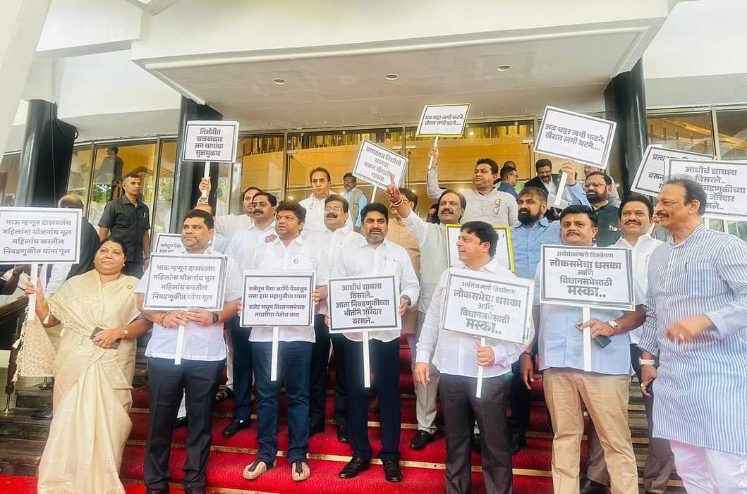 तिजोरीत खळखळाट अन् थापांचा सुळसुळाट, सत्तेतून पैसा आणि पैशातून सत्ता हा महायुतीचा ध्यास, भाऊ म्हणून दाखवलंय महिलांना योजनेचा भूल, महिला करतील यांना निवडणुकीत गुल असे आशयाचे पोस्टर घेऊन विरोधकांनी सत्ताधाऱ्यांच्या विरोधात विधिमंडळाच्या पायऱ्यांवर घोषणाबाजी केली आहे. लोकसभेच्या निवडणुकीमध्ये दस का घेतल्याने विधानसभेला मस्का लावून मतदारांना गाठण्यासाठी अर्थसंकल्पानेतून घोषणांचा पाऊस पाडण्यात आला आहे असा टोला राज्याचे विरोधी पक्ष नेते विजय वडेट्टीवार यांनी लावला आहे. आजच्या सत्रात पुन्हा एकदा शेतकऱ्यांच्या प्रश्नावर सत्ताधाऱ्यांना कोंडीत पकडण्याचा प्रयत्न विरोधकांकडून केला जाणार आहे.