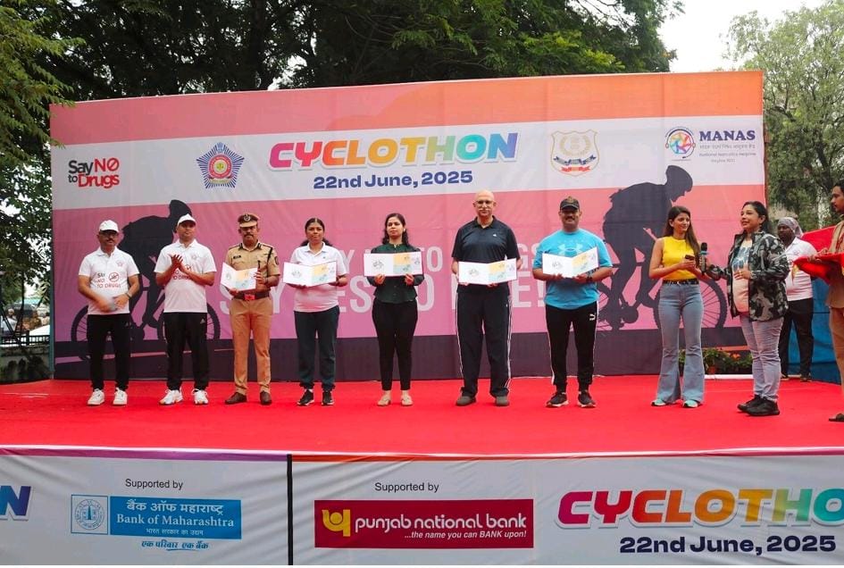 मुंबई | 26 जून रोजी आंतरराष्ट्रीय अंमली पदार्थ सेवन आणि अवैध तस्करी विरोधी दिनाचे औचित्य साधून बृहन्मुंबई पोलीस व नार्कोटिक्स कंट्रोल ब्युरो (NCB) यांच्या संयुक्त विद्यमाने अंमली पदार्थांविरोधात जनजागृती करण्यासाठी “सायक्लॉथॉन” चे आयोजन करण्यात आले. Mumbai Cyclothon या उपक्रमाला मुंबईकरांचा उत्स्फूर्त प्रतिसाद लाभला असून, युवकांनी “Say Yes to Life, No to Drugs” या घोषवाक्याचा नारा देत शहरभर रॅली काढली.