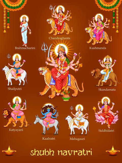 १.शैलपुत्री, २.ब्रह्मचारिणी ३.चन्द्रघंटा ४.कूष्मांडी (किंवा कुष्मांडी) ५.स्कंदमाता ६.कात्यायनी ७.कालरात्री ८. महागौरी ९.सिद्धिदात्री