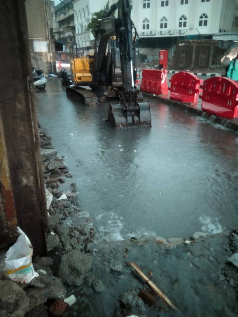 पनवेल / प्रतिनिधी:- गेल्या दोन – तीन दिवसांपासून पनवेलसह राज्यभरात मुसळधार पाउस सुरु आहे. या पहिल्याच पावसात टपाल नाक्याजवळील रस्त्यावर पाणी साचले, पावसाचा जोर वाढल्याने हे पाणी दुकानांमध्ये शिरले. पनवेल महानगर पालिकेने वीस कोटी रुपये खर्च करुन हा रस्ता अवघ्या काही दिवसांपूर्वी बनवला आहे. मात्र ठेकेदाराने रस्ता बांधताना पाणी वाहून जाण्यासाठी योग्य सोय केलीच नसल्याचे या ठिकाणी दिसते. ऐनवेळी दुकानांमध्ये, घरांमध्ये पाणी शिरल्याने एकच धावपळ उडाली. मग वीस कोटी रुपये खर्च नेमका कशावर केला ?
