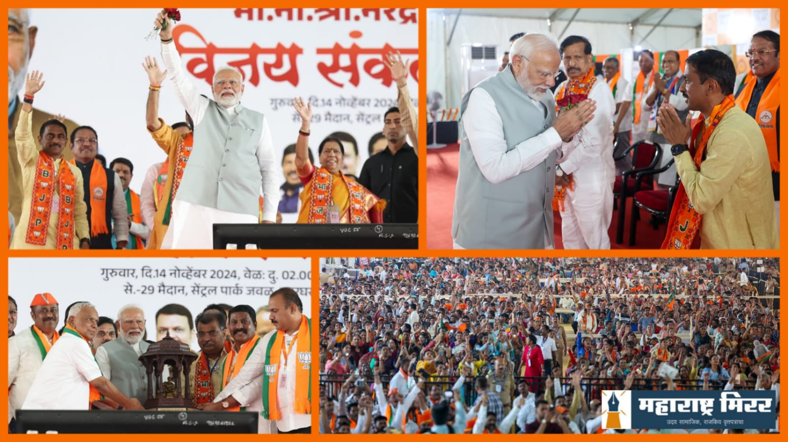 पंतप्रधान नरेंद्र मोदी म्हणाले की, देशाच्या विकासाचा संकल्प फक्त भाजप आणि महायुती सरकार करणार. काँग्रेसने फक्त गरिबाला गरीबच बनवून ठेवले आहे. गरिबी हटावचा खोट्या घोषणा देत काँग्रेसने दिवस घालवले. काँग्रेसने गरिबांना लुटलं आहे. गरीब या संकटातून बाहेर आला नाही. स्वातंत्र्यांच्या ७० वर्षानंतरही घर कपडे आणि जेवण यासाठी तरसत होते. पण पहिल्यांदा भाजप प्रणित सरकारने २५ हजार कोटी जनतेला गरिबीच्या खाईतून बाहेर काढले आहे, असेही त्यांनी सांगितले. आम्ही पक्की घर आणि सुरक्षा गरिबांना दिली. शौचालय बांधून देण्याच काम केले. जलजीवन मिशन अंतर्गत १२ करोड जनतेच्या घरात पाणी पोहोचवले. आज सगळ्यांकडे बँक खाते आहे. रेल्वे पटरीवर काम करणारा मजूरही आज युपीएयने पेमेंट करतो. गरीब माणूस स्वतः पुढे जातोय देशाला पुढे नेतोय. या सगळ्या योजनांचा सगळ्यात मोठा लाभार्थी दलित, आदिवासी आणि मागासलेल्या व्यक्तीला झाला आहे, असे त्यांनी नमूद केले. ते पुढे म्हणाले की, देशातल्या ८० करोड लोकांना मोफत रेशन पोहोचवले जात आहे. रायगडमध्ये १८ लाख लोकांना मोफत रेशन मिळत आहे. या कामाला कोणाचा विरोध असू शकतो का ? काँग्रेस पार्टीला याचा आनंद होत नाही. दुख होतय. अशा लोकांना संधी मिळाली नाही पाहीजे. खुलेआम त्यांचा एक नेता म्हणतोय जे रोहिंग्या आहेत. त्यांना स्वस्तात गॅस देणार आहेत. काँग्रसला थांबवण्याची मोठी जबाबदारी गरिबांवर आहे. २० हजार कोटींनी नवी मुंबई एयरपोर्ट बनत आहे. ८० हजार कोटींनी वाधवान बंदर बनत आहे. ८३ हजार कोटीचे सेमी कंडक्टर प्रकल्प, आशिया खंडातील दुसरा सर्वात मोठा डेटा एआय केंद्र या ठिकाणी बनणार आहे, त्यामुळे येथील युवकांना मोठी संधी निर्माण होत असल्याचेही त्यांनी म्हंटले. माझी लाडकी बहीण योजना बंद करण्यासाठी काँग्रेस महाआघाडीने प्रयत्न केले. न्यायालयात गेले पण ते या योजना बंद करण्याच्या प्रयत्नात असलेले तरी आम्ही ०३ करोड बहिणीना लखपती करणार आहोत, त्या अनुषंगाने महिलांच्या विकासासाठी योजना अंमलात आणत असून त्यांना दरवर्षी किमान १ लाख रुपये मिळतील असे नियोजन आमचे आहे. असेही त्यांनी नमूद करतानाच लाडकी बहीण योजना सुरूच राहणार असल्याचे अधोरेखित केले. तसेच देशातील प्रत्येक नागरिकाने एकसंघ राहिले पाहिजे असेही नमूद केले. त्याचबरोबर तुम्ही फक्त आमदार नाही तर महाराष्ट्राचा विकास निवडणार आहात, त्यामुळे महायुतीच्या उमेदवारांना प्रचंड मतांनी विजयी करा असे आवाहनही त्यांनी जनतेला केले.