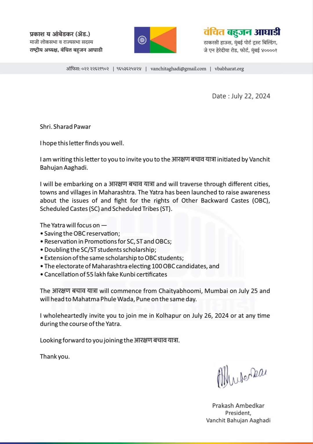 “वंचित बहुजन आघाडीने सुरू केलेल्या आरक्षण बचाव यात्रेत सामील होण्यासाठी मी हे पत्र लिहित आहे. मी आरक्षण बचाव यात्रेला जाणार असून ही यात्रा महाराष्ट्राच्या विविध भागात होणार आहे. हा प्रवास इतर मागासवर्गीय (ओबीसी), अनुसूचित जाती (एससी) आणि अनुसूचित जमाती (एसटी) यांच्या हक्कांच्या प्रश्नांबाबत जागरुकता निर्माण करण्यासाठी आणि त्यांच्या हक्कांसाठी लढण्यासाठी सुरू करण्यात आला आहे.