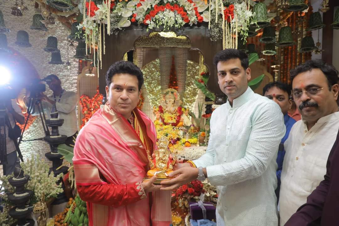 भारतरत्न सचिन तेंडुलकर यांने मुख्यमंत्री एकनाथ शिंदे यांच्या निवासस्थानी जाऊन गणरायाचे दर्शन घेतले आहे. सचिन याचे मुख्यमंत्री एकनाथ शिंदे आणि खासदार श्रीकांत शिंदे यांनी स्वागत केले आहे.