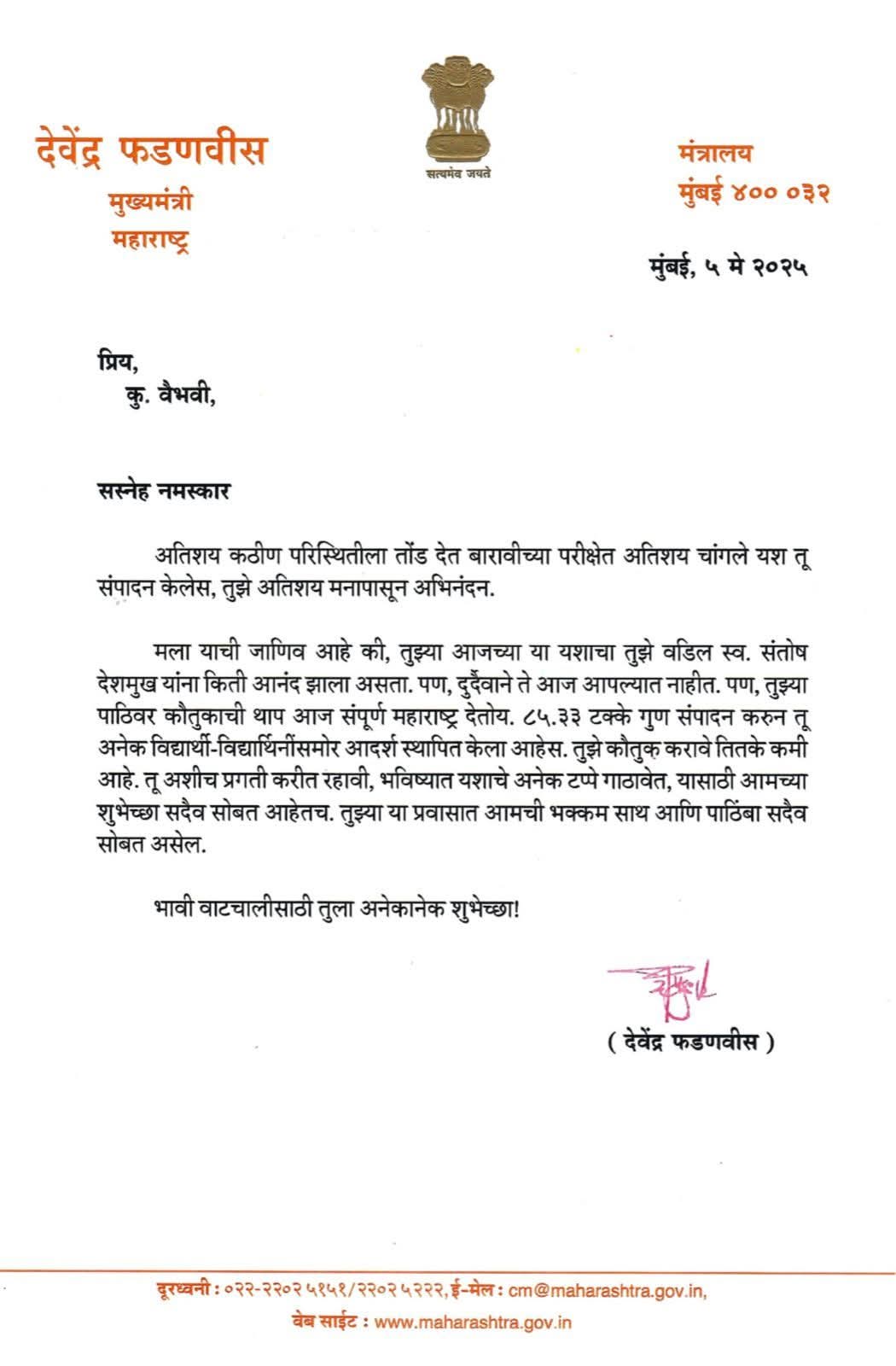 बारावीच्या परीक्षेमध्ये वैभवी देशमुख हिने घवघवीत यश मिळवल्याचे समजल्यानंतर देवेंद्र फडणवीस यांनी वैभवी देशमुख हिला फोन केला. तसेच तिचं अभिनंदन करत तिला शुभेच्छा दिल्या. तसेच वैभवी हिला खास अभिनंदन पत्रही पाठवले. अंबेजोगाईचे SDO दीपक वाजळे यांनी वैभवी देशमुख हिला प्रत्यक्ष भेटून मुख्यमंत्र्यांनी पाठवलेले पत्र तिच्याकडे सुपुर्द केले.