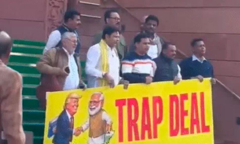 सभागृहाचे कामकाज सुरू होण्यापूर्वीच विरोधी पक्षाच्या खासदारांनी संसदेच्या आवारात निदर्शने केली. यावेळी त्यांच्या हातात केंद्र सरकारच्या प्रस्तावित व्यापारी कराराविरोधात फलक होते. “हा ‘ट्रेड डील’ नसून भारतासाठी ‘ट्रॅप डील’ (साखळदौंड) आहे,” असा आरोप करत विरोधकांनी सरकारला धारेवर धरले. या करारातून देशाचे हित धोक्यात येत असल्याचा दावा काँग्रेससह मित्रपक्षांनी केला आहे.