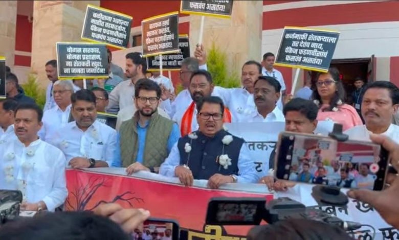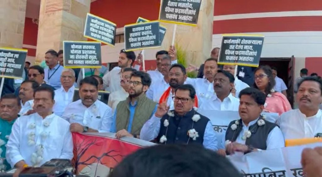 नागपूर :- नागपूर हिवाळी अधिवेशनाच्या आजच्या (9 डिसेंबर) कामकाजाला सुरुवात होण्यापूर्वीच महाविकास आघाडीच्या आमदारांनी विदर्भ आणि मराठवाड्यातील कापूस, सोयाबीन उत्पादक शेतकऱ्यांच्या प्रश्नांवरून विधानभवनाच्या पायऱ्यांवर जोरदार शक्तीप्रदर्शन केले. सत्ताधारी महायुती सरकारला धारेवर धरत “शेतकरी उपाशी, सरकार तूपाशी!” अशा घोषणा यावेळी देण्यात आल्या.