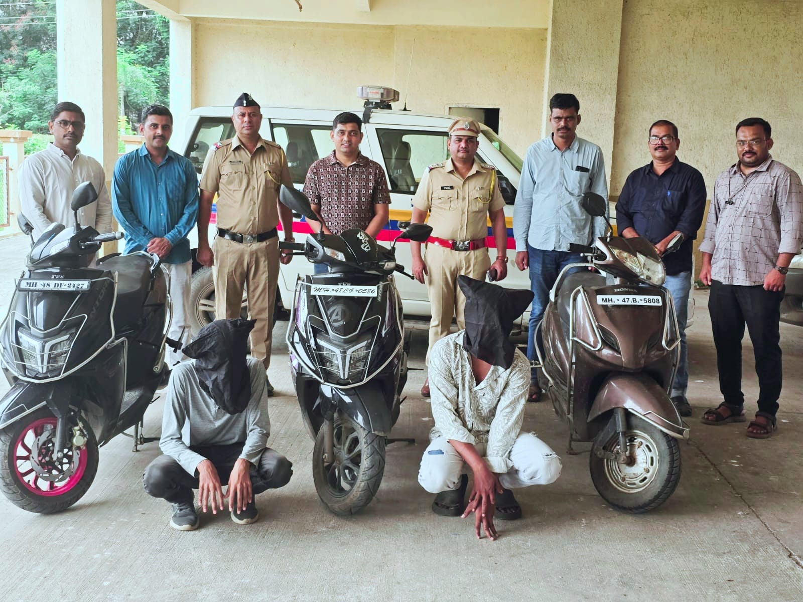 विरार पश्चिममधील विष्णु पार्क व चिखलडोंगरी रोड येथून चॉकलेटी रंगाची टीव्हीएस ज्युपिटर आणि काळ्या रंगाची (NTORQ 125 RACE XP) स्कुटी चोरीला गेल्याची तक्रार अनुक्रमे 14 व 16 जून 2028 रोजी नोंदविण्यात आली होती. चोरीची साखळी थांबवण्याच्या सूचना वरिष्ठांकडून मिळाल्यानंतर,पोलीस निरीक्षक (गुन्हे) प्रकाश सावंत व गुन्हे प्रकटीकरण पथकाचे पोलीस उप निरीक्षक किरण वंजारी, यांच्या नेतृत्वाखाली गुन्हे प्रकटीकरण पथकाने तपासाला वेग दिला.यांनी घटनास्थळांची पाहणी करून, परिसरातील सीसीटीव्ही फुटेज चोखपणे तपासले. संशयितांची हालचाल टिपून गुप्त बातमीदारांद्वारे मिळालेल्या माहितीतून अनुराग सुंदरम आणि मान्तेश कोळी या दोन सराईत चोरट्यांना 20 जून रोजी विरार पश्चिम परिसरातून जेरबंद करण्यात आले.