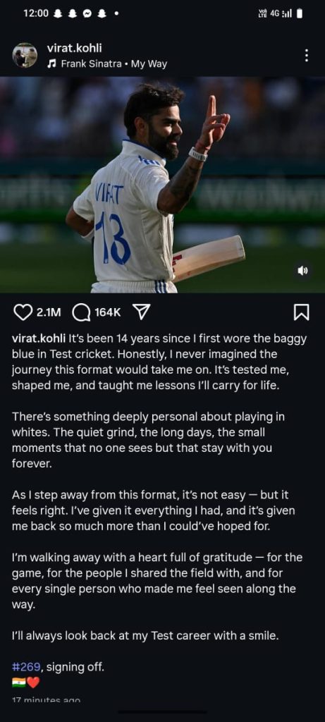 विराट कोहलीने कसोटी जर्सीमधील स्वतःचा एक फोटो शेअर केला आणि लिहिले,कसोटी क्रिकेटमध्ये पहिल्यांदा बॅगी ब्लू जर्सी घालण्यात आल्याला १४ वर्षे झाली आहेत. खरं सांगायचं तर, हे फॉरमॅट मला कोणत्या प्रवासावर घेऊन जाईल याची मी कधीच कल्पना केली नव्हती. त्याने माझी परीक्षा घेतली, मला आकार दिला आणि मला असे धडे शिकवले जे मी आयुष्यभर माझ्यासोबत घेऊन जाईन.